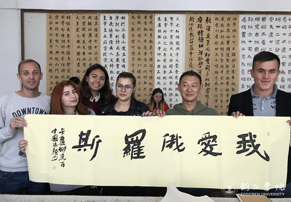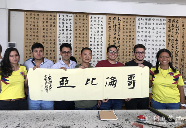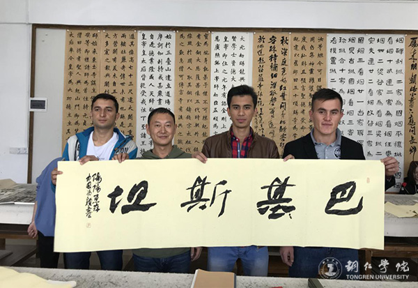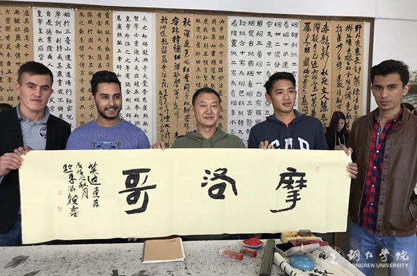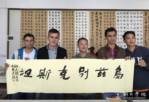 课上,冯颖就握笔、行笔方式及书写要点作了讲解。他说,要注意写字和拿笔的姿势,只有姿势正确,字体的受力才会均匀,写出来的汉字才会更好。同时,书写时字形要连贯,一气呵成,文字才显得自然流畅,优美和谐。随后,留学生们纷纷动手一笔一划写了起来,他们从一开始无法拿住毛笔到运用自如,书写的字体从歪来扭去到有模有样,留学生们的进步很快。他们用略显稚嫩的字体写下自己国家的名字、“中巴友谊万岁”“爱中国”等字样。