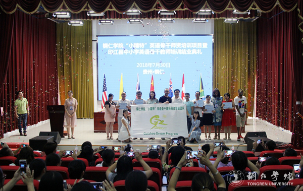 7月30日上午,由美加墨世界杯官方网站和印江县教育局共同主办,世界杯官网国际学院承办的“小精特”英语骨干师资培训项目暨印江县中小学英语骨干教师培训结业典礼在人文生态馆顺利举行。世界杯官网发展规划处处长兼社会服务中心主任罗静、国际学院党委书记张志会、招生与就业指导处副处长赵坤出席,来自美国、南非、哥伦比亚等国家的11名外籍教师以及印江县中小学180名英语骨干教师参加了结业典礼。结业典礼由国际学院杨雨桦老师主持。 典礼上,该项目负责人杨国忠老师对本次“小精特”培训的前期准备工作、项目实施过程、教学重点难点、户外拓展和存在的问题进行了详细总结;印江一中教师黄昭平代表学员进行了交流发言,分享了培训期间的收获和体会,他表示要将培训期间的所学所获,结合实际运用到实际教学中去,进一步提升英语课堂教学创新能力;哥伦比亚籍教师Yeinson代表培训教师作了交流发言,对美加墨世界杯官方网站所搭建提供的平台表示衷心感谢,分享了作为外籍教师的培训心得体会和课堂教学感受。他表示要继续与中方教师探讨,合作交流,共同提升,共同服务英语课堂教学;与会领导向学员颁发了结业证书和优秀学员证书。