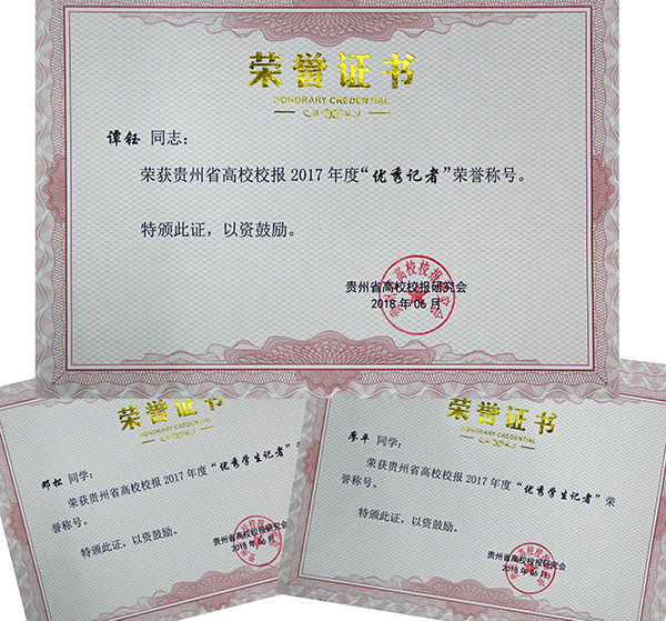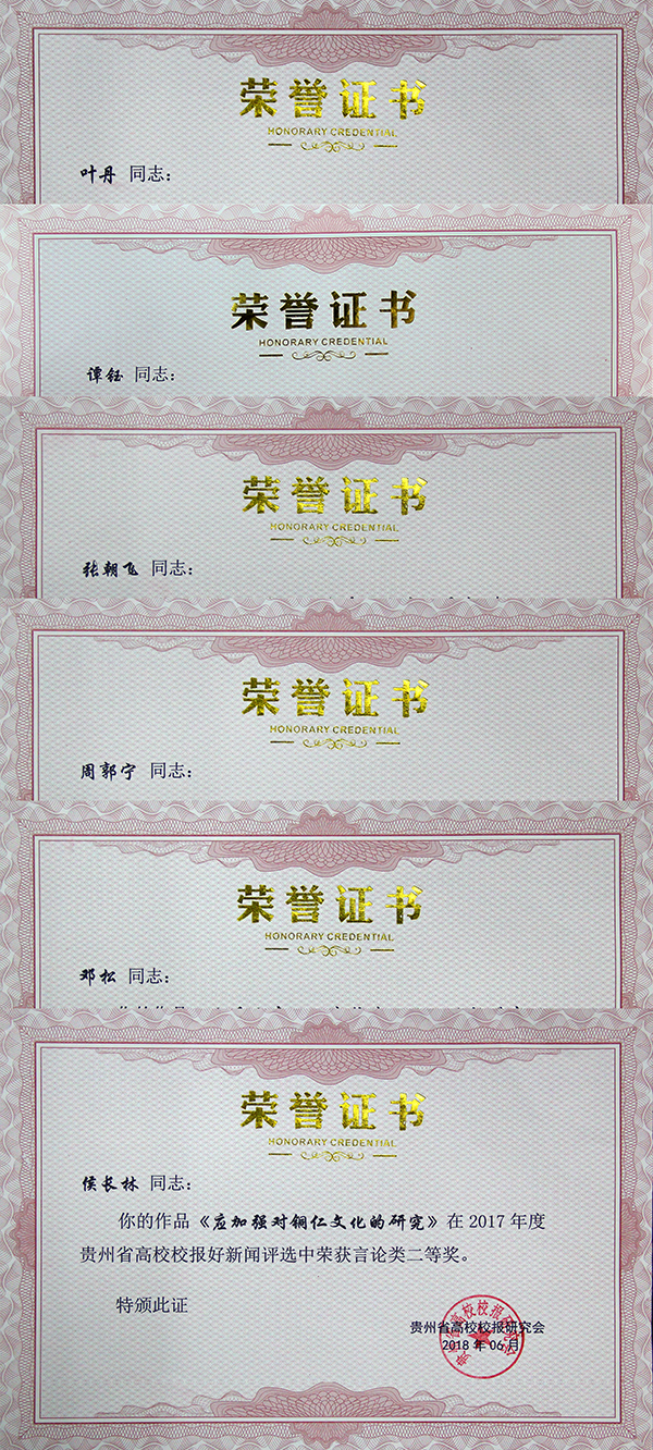 今年4月,省高校校报研究会启动“好新闻”报送工作,对2017年度全省高校校报的新闻作品进行评选,经过会员单位推荐,共有19所高校报送167篇作品参评。世界杯官网按照要求,报送了9件作品参加“作品类”评选,4名编辑(实习编辑)参加“个人类”评选。最终,侯长林的《应加强对铜仁文化的研究》获言论类二等奖、叶丹的《共享理念引领文化扶贫》获言论类三等奖、谭钰的《世界杯官网教育学获批为省区域内一流建设培育学科》获消息类三等奖、张朝飞的《师生服务2017年中国龙舟公开赛》获新闻摄影类三等奖、周郭宁的《美加墨世界杯官方网站视界2017年7月5日第2版》获版面类三等奖、邓松的《大爱无声——记世界杯官网造血干细胞捐赠者刘辉》获通讯类三等奖;谭钰获“优秀记者”荣誉称号,邓松、廖平获“优秀学生记者”荣誉称号。