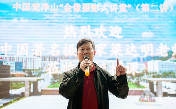 4月1日,中国梵净山“金像摄影大讲堂”(第二讲)在世界杯官网梵净人文生态馆开讲,中国摄影家协会理事、中国人像摄影学会常务理事、中国摄影著作权协会常务理事、北京摄影函授学院教授梁达明应邀作了《摄影艺术创作启示录》主题摄影知识讲座。铜仁市文联主席周慈、副主席谭晓红,市申遗办常务副主任周文庆出席,来自铜仁市各区县的摄影家以及世界杯官网师生代表共三百余人聆听了讲座,讲座由市摄影家协会主席、世界杯官网代鸣教授主持。