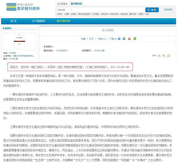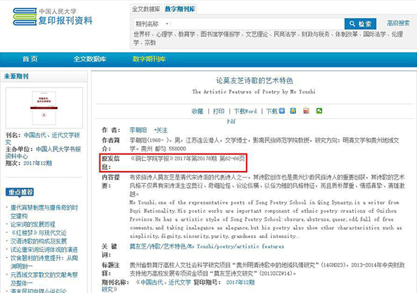 近日,从中国人民大学复印报刊资料数据库获悉,《美加墨世界杯官方网站学报》2017年第8期刊发的论文《论莫友芝诗歌的艺术特色》被中国人民大学书报资料中心复印报刊资料《中国古代、近代文学研究》2017年第12期全文转载。成为《美加墨世界杯官方网站学报》2017年度继侯长林教授《“康奈尔计划”对新型大学建设的启示》、梁成艾教授《乡愁文化建设应重点抓好其路径优化工作》之后第三篇被人大复印报刊资料转载的论文。