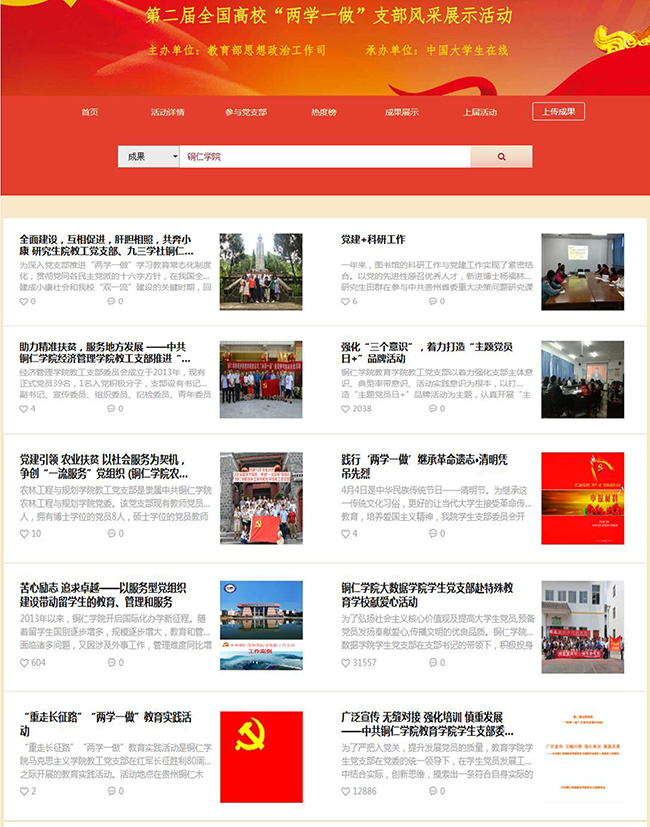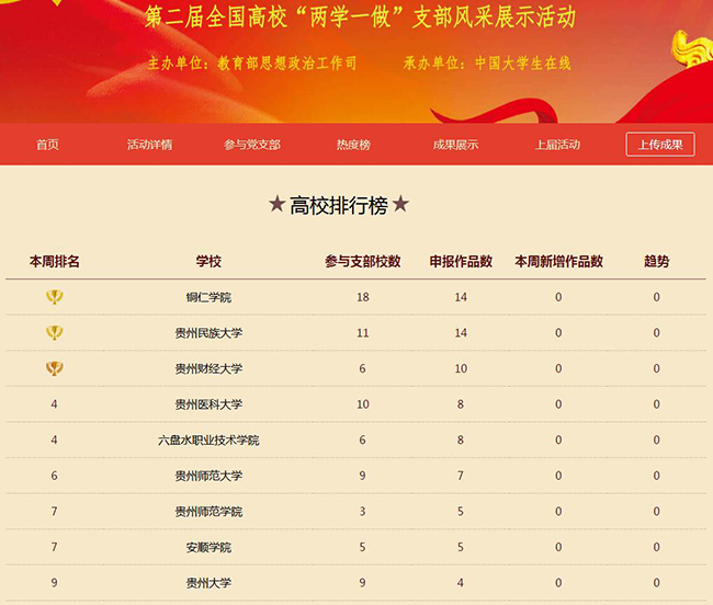2017年7月至12月,教育部思想政治工作司主办、中国大学生在线承办了第二届全国高校“两学一做”支部风采展示活动。近日,活动举办方公布了作品申报成功结果,世界杯官网共有14件作品申报成功,在高校排行榜中位列贵州省高校第一。