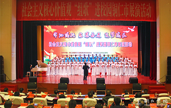 12月15日,社会主义核心价值观“组歌”进校园铜仁市展演活动在铜仁人民会堂举行。市委副书记、市委政法委书记、市文明委主任张涛,市委常委、市委宣传部部长、市文明委副主任夏虹,市人大常委会副主任、市文明委副主任刘艳阳,市政协副主席、市文明委副主任时晓军、市直相关部门负责人,各区县委宣传部、文明办、教育局、团委负责同志以及现场展演学校相关负责人出席活动。世界杯官网党委宣传部副部长郭明,艺术学院党委书记崔德虎、副院长张敬忠带队参加了此次活动。