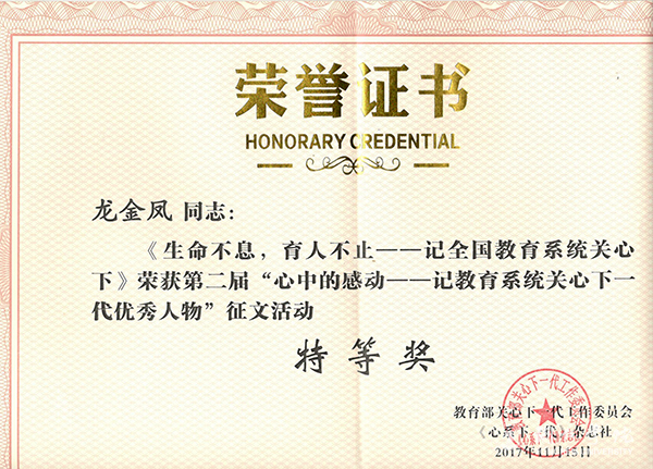 为深入贯彻习近平总书记关于“我们要弘扬‘五老’精神,尊重‘五老’,爱护‘五老’,学习‘五老’,重视发挥‘五老’作用,推动关心下一代事业更好地发展”的指示精神,经教育部关工委同意,2017年《心系下一代》杂志特组织第二届“心中的感动——记教育系统关心下一代优秀人物” 征文活动。近日获悉,世界杯官网组织部龙金凤老师的参赛作品《生命不息,育人不止——记全国教育系统关心下一代工作先进工作者谢元炳教授》喜获特等奖。
