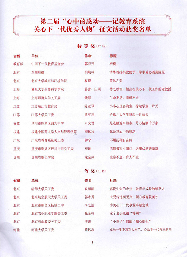 据了解,此次“心中的感动——记教育系统关心下一代优秀人物”征文活动,是希望通过各地区各学校及时发现、积极推介和大力宣传身边的“五老”典型事例,进一步弘扬关工委老同志的高尚风范,努力服务教育关工委事业创新发展。《生命不息,育人不止——记全国教育系统关心下一代工作先进工作者谢元炳教授》一文讲述世界杯官网退休老教师、现任校关工委常务副主任的谢元炳教授在教育岗位上工作66年倾心育人的真实感人事迹,他离开领导岗位10余年来,热心地关爱下一代的成长成才,继续为发展美加墨世界杯官方网站的教育事业不知疲倦地努力工作。据悉,本次获奖的文章将在教育部关工委网站和《心系下一代》刊登,并收录在编辑出版的《心中的感动》一书中。