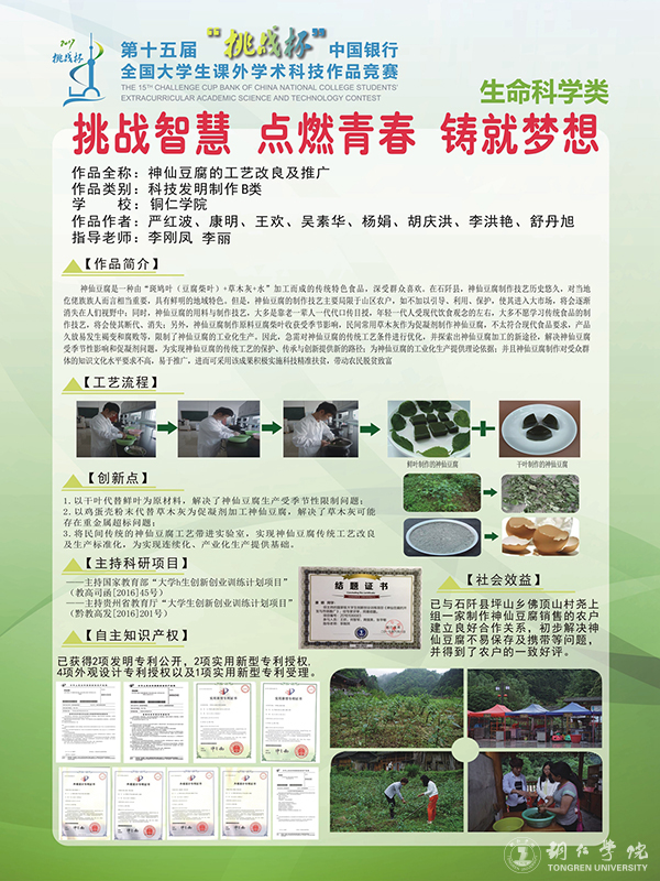 神仙豆腐是一种由“斑鸠叶(豆腐柴叶)+草木灰+水”加工而成的传统特色食品,深受群众喜欢。该作品以干叶代替鲜叶为原材料,解决了神仙豆腐生产受季节性限制问题;以鸡蛋壳粉末代替草木灰为促凝剂加工神仙豆腐,解决了促凝剂问题;将民间传统的神仙豆腐工艺带进实验室,实现神仙豆腐传统工艺改良及生产标准化,为实现连续化、产业化生产提供基础,并且神仙豆腐制作对受众群体的知识文化水平要求不高,易于推广,进而可采用该成果积极实施科技精准扶贫,带动农民脱贫致富。该作品从2014年至2017年,实施接近三年多的时间,完成了国家级大学生创业训练项目1项,申请发明专利2项,实用新型专利授权3项,外观设计专利授权4项,发表核心期刊论文1篇,完成调研报告、研究报告各1份。