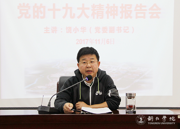 11月6日,党委副书记饶小华在行政楼8501会议室为其分管部门宣讲党的十九大精神。党委宣传部、党委组织部、党委统战部、党委学工部、团委、人事处、招生就业处教师参加学习。