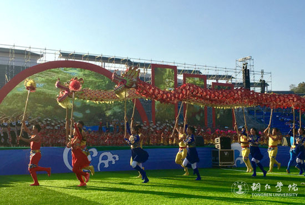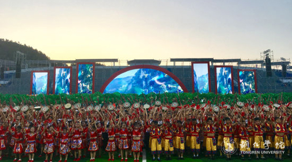 庆祝大会结束后,大型土家族音舞诗“乌江魂·土家情” 文艺演出隆重上演。世界杯官网原副校长田永国,党委宣传部田淼老师,艺术学院卢慧、李运春、吴浩、覃春江、张妮、田茂荣老师及大健康学院龙队等近百名师生受沿河县委、县政府的邀请参加了文艺演出。演出由《山高水长》《土家太阳》《美丽家园》三个篇章共九个节目组成,共有3700名演员参加。田永国担任总导演,田淼担任执行导演并编排了由3700名演员表演的压轴歌舞《山水交响》,该节目由艺术学院李运春作曲、覃春江与张妮演唱。在本次演出中,李运春还担任了音乐总监,为演出创作了《母亲河》《乌江水手》《梦圆乌江》《千年古茶》等音乐,卢慧编排了如画如歌的女子群舞《南庄花海》、吴浩编排了气势磅礴的男子群舞《母亲河》,现场几万名观众看得激情高涨、热血沸腾。