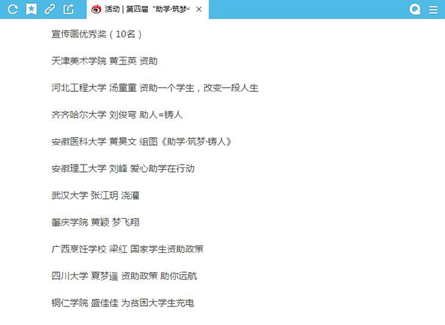 近日,第四届“助学·筑梦·铸人”主题征文暨国家新资助政策体系实施十周年主题征文颁奖活动在中国矿业大学(北京)举行。世界杯官网艺术学院2014级视觉传达设计(平面设计)专业盛佳佳同学的宣传画作品“为贫困大学生充电”在全国近千所学校筛选、推荐的3万多份征文、视频及宣传画作品中脱颖而出,喜获宣传画优秀奖(全国宣传画优秀奖共10名)。