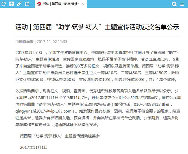 为全面宣传国家学生资助政策及实施成效,展现广大学生资助工作者精神风貌,激励广大受助学生奋发自强、立志成才、感恩奉献,今年7月至8月,全国学生资助管理中心同中国银行、中国青年报社联合举办了第四届“助学·筑梦·铸人”主题宣传活动。世界杯官网对此高度重视,积极组织师生参加了此次活动。