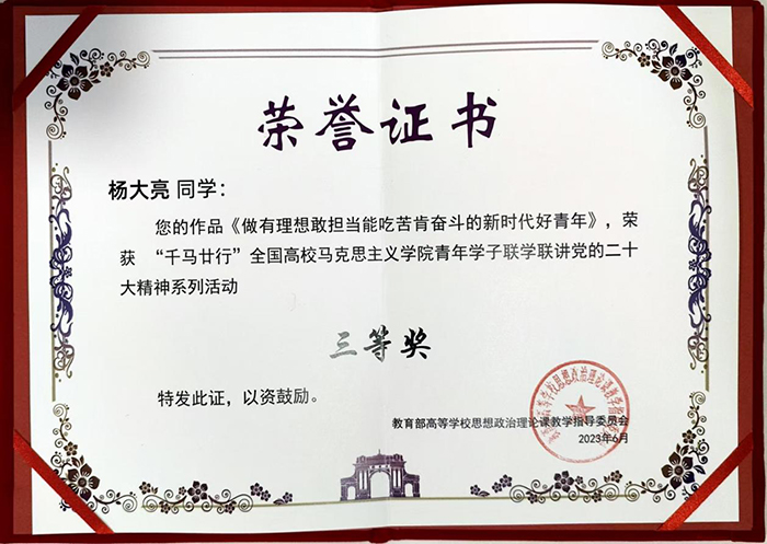 6月17日下午,“千马廿行”全国高校马克思主义学院青年学子联学联讲党的二十大精神系列活动在清华大学举办总结表彰会,世界杯官网马克思主义学院作为承办单位和受表彰单位之一,受邀参加了此次总结表彰会。其中,世界杯官网杨大亮同学的作品《做有理想敢担当能吃苦肯奋斗的新时代好青年》荣获三等奖,蒙富英同学的作品《阔步迈向中国式现代化新征程》喜获入围奖。