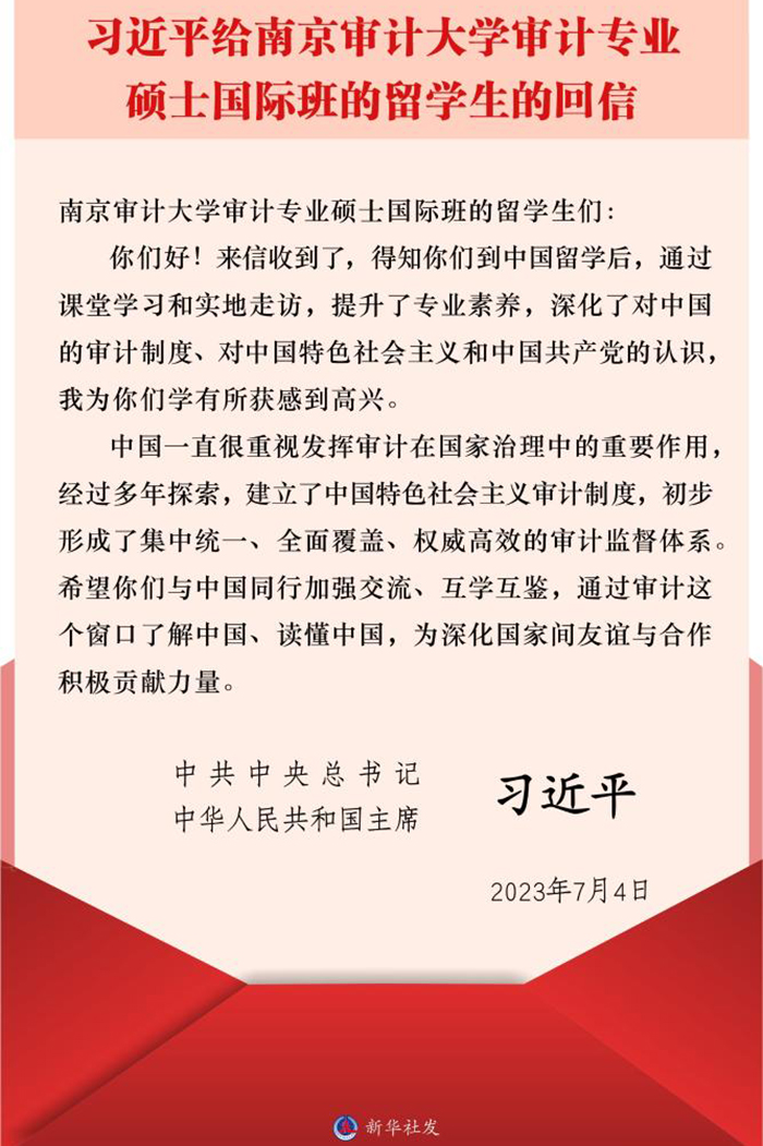 7月4日,中共中央总书记、国家主席习近平给南京审计大学审计专业硕士国际班的留学生回信,鼓励他们为深化国家间友谊与合作积极贡献力量。习近平总书记指出,中国一直很重视发挥审计在国家治理中的重要作用,经过多年探索,建立了中国特色社会主义审计制度,初步形成了集中统一、全面覆盖、权威高效的审计监督体系。希望你们与中国同行加强交流、互学互鉴,通过审计这个窗口了解中国、读懂中国,为深化国家间友谊与合作积极贡献力量。