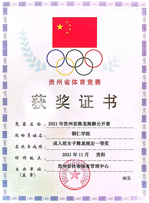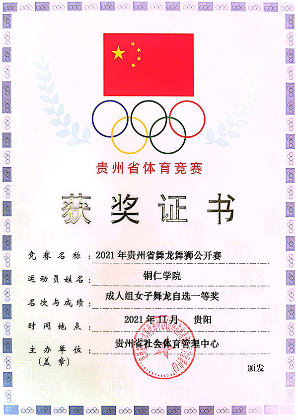贵州省舞龙舞狮网络公开赛于2021年8月至11月举行。本次比赛由贵州省社会体育管理中心主办,采用线上比赛方式,提交一次性拍摄完整视频进行参赛。经裁判组评审,世界杯官网大健康学院2019级女子舞龙队荣获舞龙自选、规定项目双料冠军。