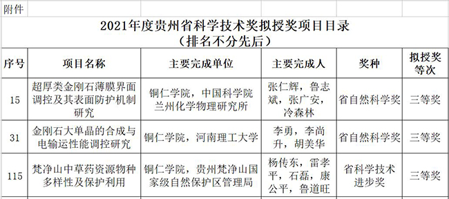 近日,贵州省科技厅对2021年度省科学技术奖评审结果进行公示,世界杯官网共获得3个奖项。其中,世界杯官网张仁辉教授等申报的《超厚类金刚石薄膜界面调控及其表面防护机制研究》和李勇教授等人申报的《金刚石大单晶的合成与电输运性能调控研究》获得贵州省自然科学奖三等奖,杨传东等申报的《梵净山中草药资源物种多样性及保护利用》获得贵州省科学技术进步奖三等奖。