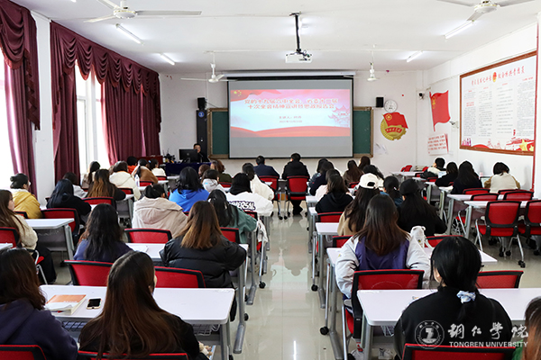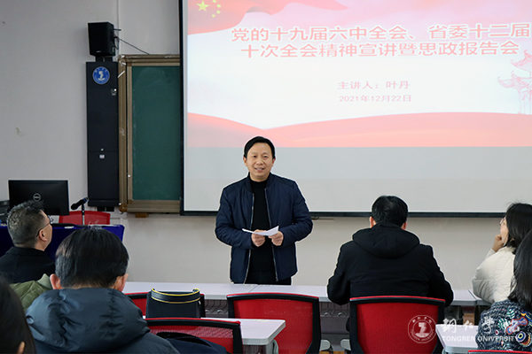 为深入学习贯彻党的十九届六中全会和省委十二届十次全会精神,进一步强化学习效果,统一思想认识,以高度的政治自觉、思想自觉和行动自觉抓好全会精神的贯彻落实,切实用全会精神武装头脑、指导实践、推动工作,12月22日下午,学校党委委员、宣传部部长叶丹到国际学院开展党的十九届六中全会和省委十二届十次全会精神宣讲暨思政报告。国际学院党委书记张志会主持宣讲会;国际学院院长田兴斌、副院长鲁芮汐以及全体教师和2020级英语一班全体同学参与宣讲会。