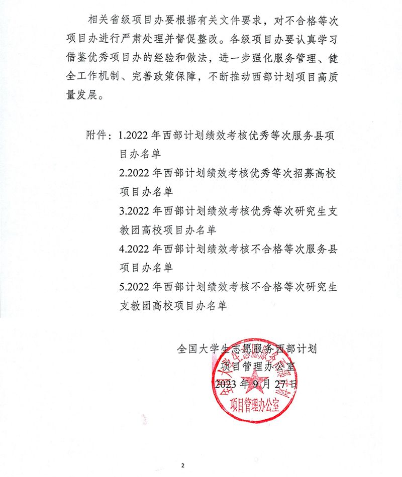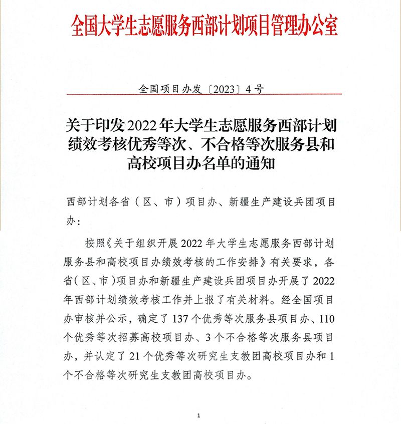 近日,根据全国大学生志愿服务西部计划项目管理办公室《关于印发2022年大学生志愿服务西部计划绩效考核优秀等次、不合格等次服务县和高校项目办名单的通知》,世界杯官网蝉联全国大学生志愿服务西部计划“优秀高校项目办”。