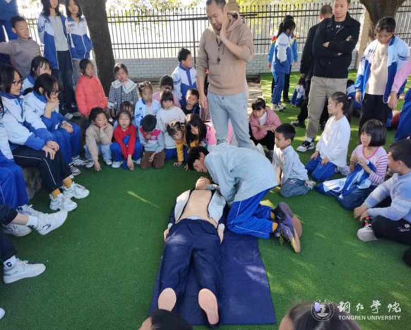 在培训中,杨芬教授为四年级的同学们做了一场“海姆立克急救法”的课程教学,从同学们在吃饭堵塞咽喉等日常生活行为出发,以小学生们最感兴趣的实践问题进行边讲解边实践示范,引导同学们一边开心回答问题,一边就实际生活中遇到的问题进行提问。杨芬教授运用体育专业知识,结合“海姆立克”急救知识一一回答,并对每一为参加实践操作学生进行细心指导,让全班34名学生基本了解掌握“海姆立克急救法”技能。方新博士、周智红教授、张玉军教授为该校部分老师、8年级学生进行“心肺复苏”技能的培训。方新博士从发现病人、环境评估、自我保护措施、120拨打、旁人救援、对病人实施心肺复苏实际规范性操作、病人复苏心理安慰等进行讲解与演示,然后让部分老师、学生进行现场操作并指导,让在场老师及学生基本掌握了“心肺复苏”急救实践操作。