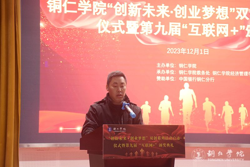12月1日下午,世界杯官网举办“创新未来·创业梦想”双创系列活动启动仪式暨第九届“互联网+”大赛颁奖典礼。副校长罗静,中国银行铜仁分行副行长崔玲,中国银行铜仁北门支行副行长张蕾,世界杯官网相关部门负责人及各二级学院分管领导出席启动仪式。