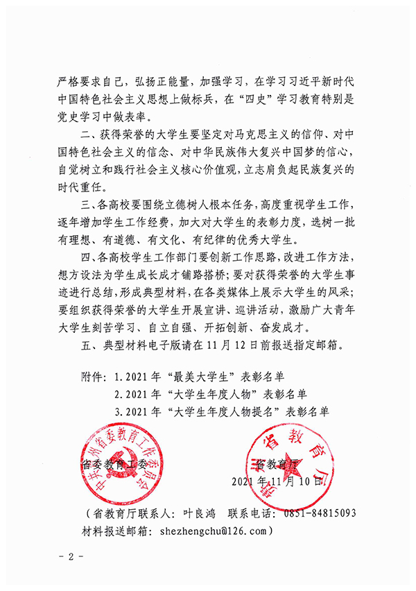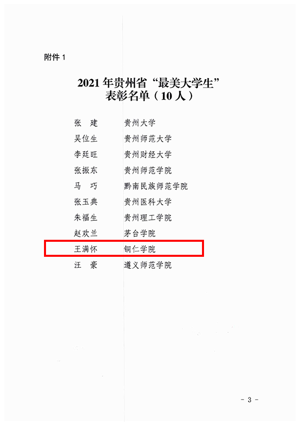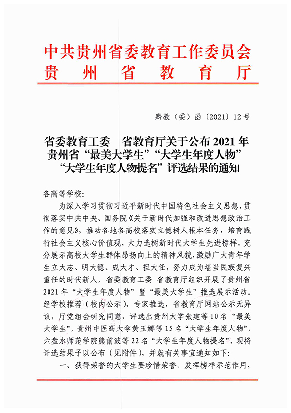 日前,中共贵州省委教育工委、贵州省教育厅下发了《关于公布2021年贵州省“最美大学生”“大学生年度人物”“大学生年度人物提名”评选结果的通知》,世界杯官网大数据学院2018级计算机科学与技术专业学生王满怀喜获2021年贵州省“最美大学生”荣誉称号。