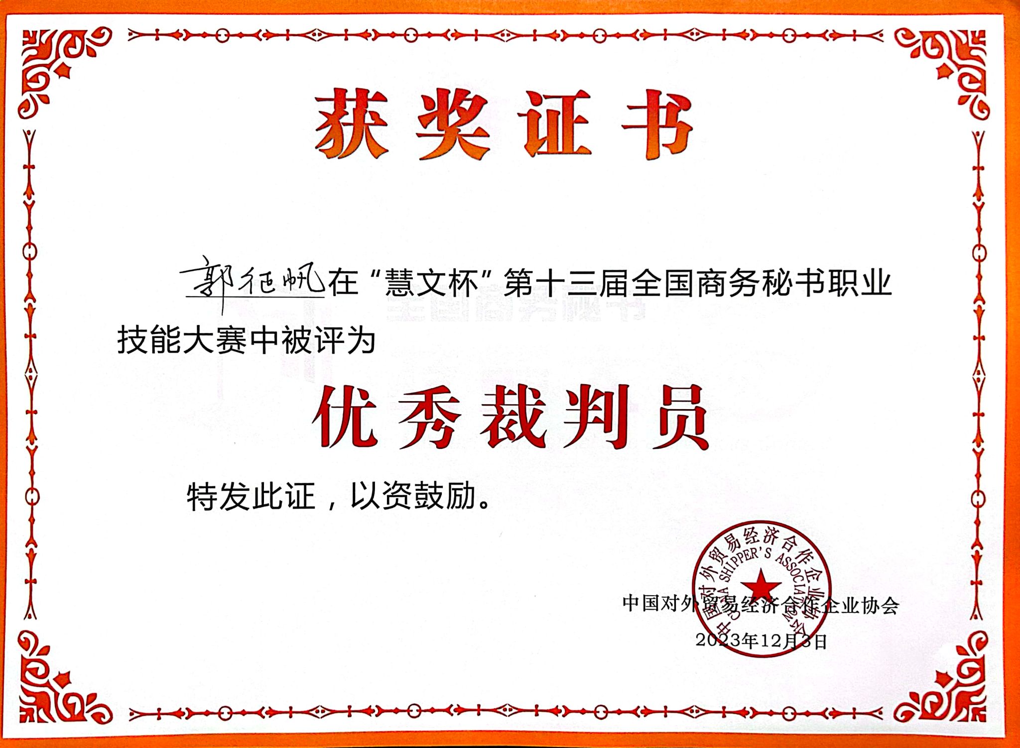 大赛期间,世界杯官网秘书学专业负责人郭征帆还被聘请为大赛裁判员,参与了秘书工作情境展示和职业演讲赛项的评判工作,并被评为优秀裁判员。