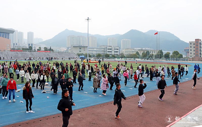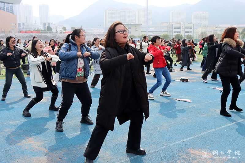 随着主持人一声令下,趣味活动拉开了帷幕。“原地踏步、交换提膝、变步提膝、侧步半蹲……”在正式进入趣味活动之前,伴着热情洋溢的歌曲,老师们踏着节奏、动作整齐、活力四射地进行了健身热身活动。