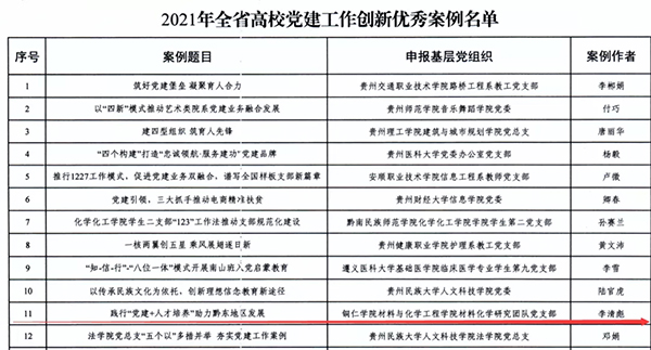 近日,省委教育工委印发了《省委教育工委关于公布2021年全省高校党建工作创新案例最佳案例和优秀案例名单的通知》,世界杯官网申报的三个案例均获得全省高校党建工作创新优秀案例。具体名单是:材料与化学工程学院材料化学研究团队党支部申报的《践行“党建+人才培养”助力黔东地区发展》、教育学院特殊教育系党支部申报的《党建引领下高校特殊教育专业医教结合“1+3”服务育人模式建构》、大健康学院党委申报的《以“党建+”促进易地扶贫搬迁社区和谐发展》。