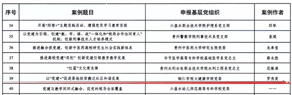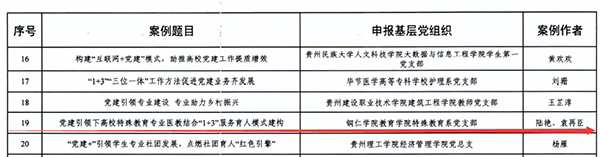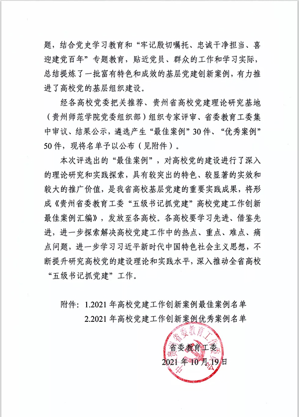 为深入学习贯彻习近平总书记系列重要讲话精神和关于加强高校党建工作的重要论述,贯彻落实《中国共产党普通高等学校基层组织工作条例》,总结高校党建工作先进经验,按照《贵州省高校“五级书记抓党建”工作“五个一批”工程实施方案》安排部署,学校党委高度重视,严格审核,于2021年上半年向省委教育工委推荐了三个党建工作创新案例。