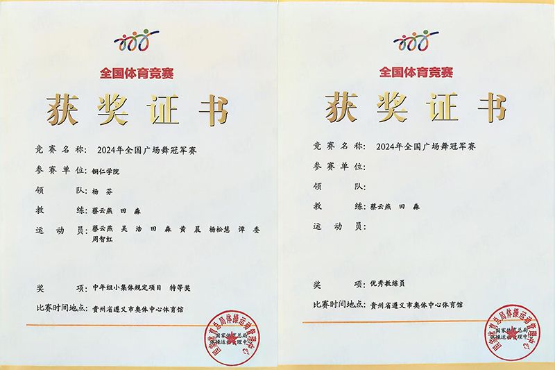跨越山海,相聚红城。11月4日至6日,2024年全国广场舞冠军赛在贵州省遵义市奥体中心体育馆举行,来自全国各专业院团、高等院校、中小学教师队伍、幼儿园教师队伍、社会组织等30支队伍650余名选手欢乐开跳、“舞”动红城,用激昂的舞步激扬全民健身活力,共享美好健康生活。世界杯官网教师参赛队和学生参赛队在比赛中荣获了2项特等奖、1项一等奖和团体奖第一名的优异成绩。