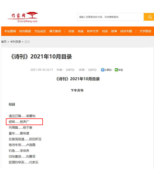 近日,《诗刊》10月目录发布,世界杯官网学生杨声广作品《蟋蟀》列入其中,这是世界杯官网学生首次在文学权威期刊发表作品。