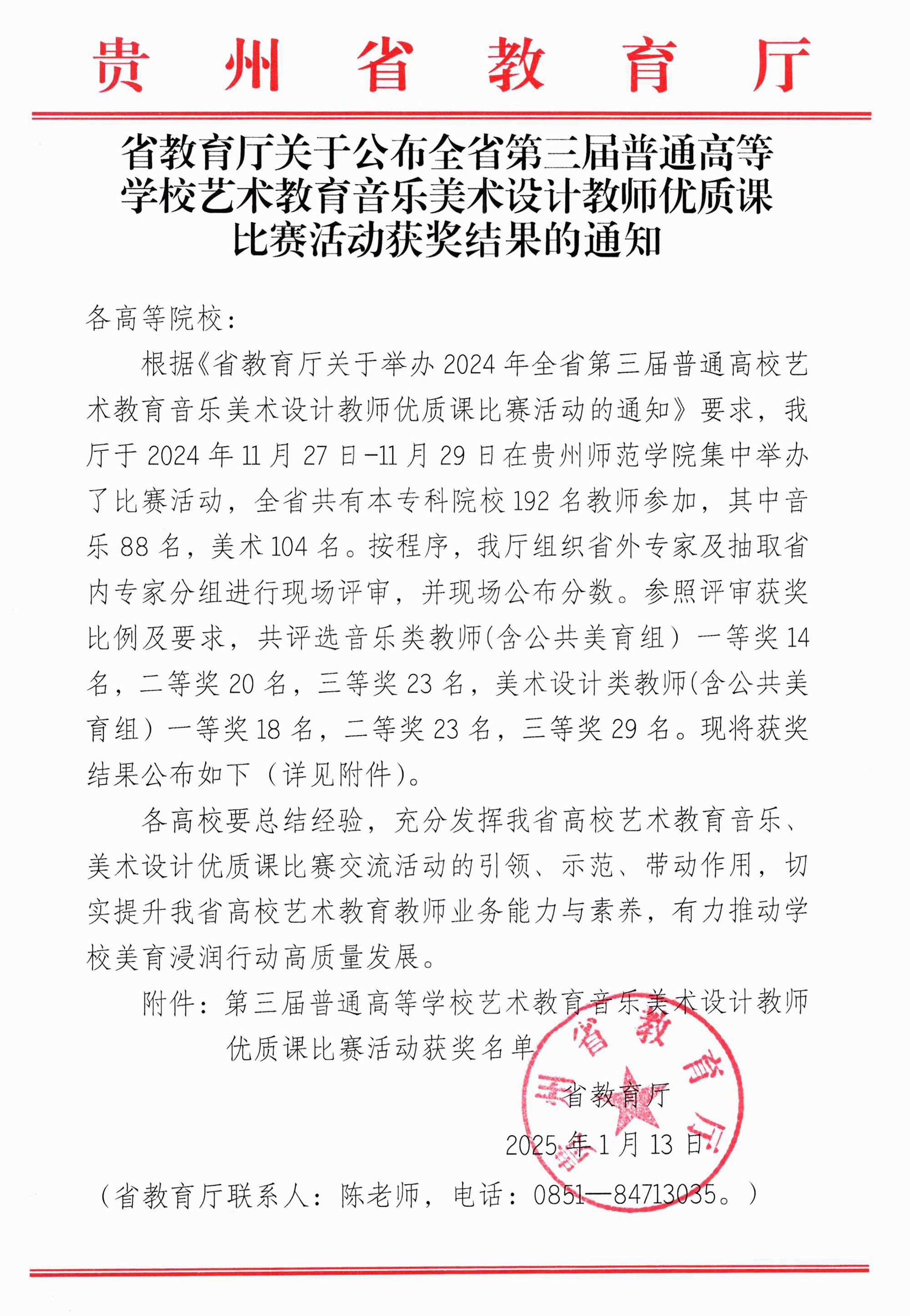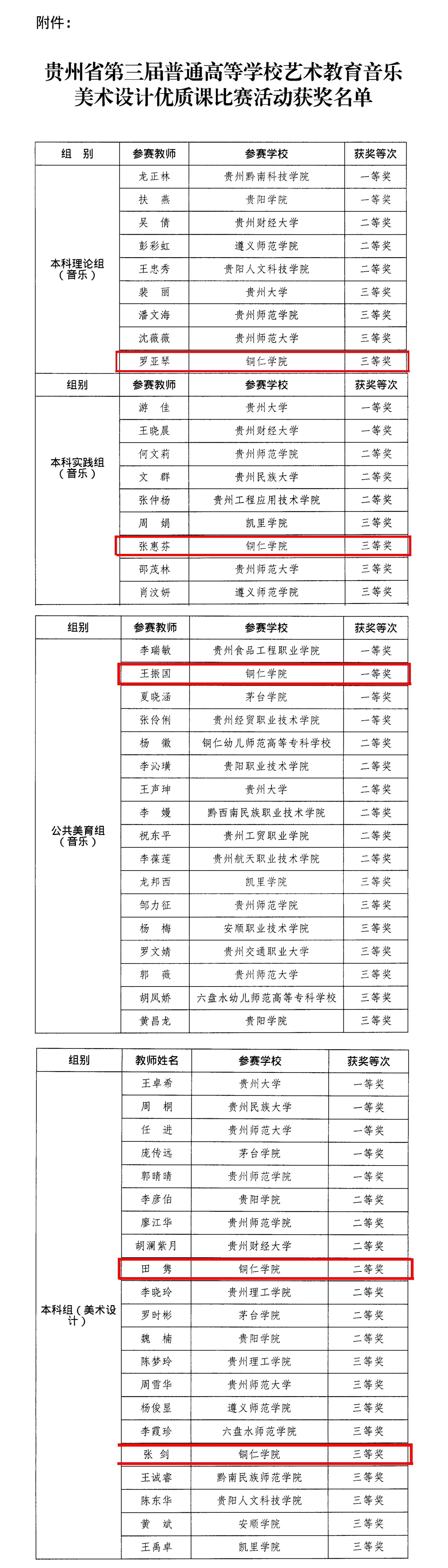 近日,省教育厅公布了全省第三届普通高校艺术教育音乐美术设计教师优质课比赛活动获奖结果,世界杯官网艺术学院教师荣获一等奖1名、二等奖1名、三等奖3名的好成绩。