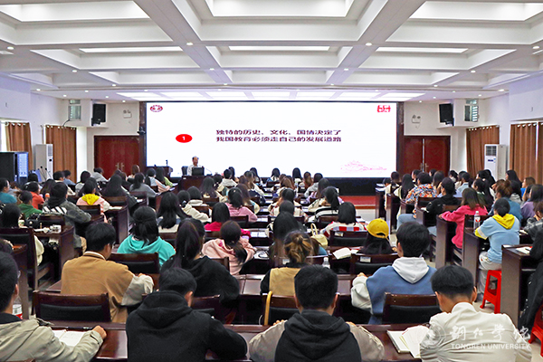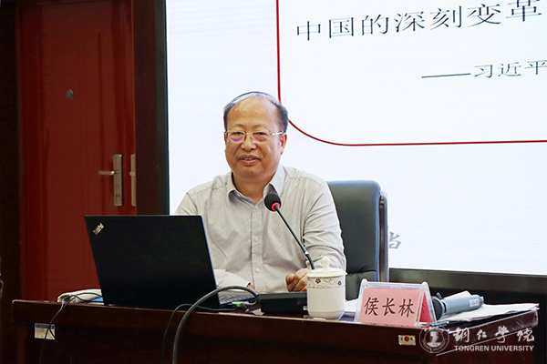 这堂课的主题是“教育发展要走自己的路--坚持扎根中国大地办教育”,侯长林从扎根中国大地办教育的逻辑起点、逻辑支点和逻辑归宿三个层面,讲述了中国的教育必须按中国的特点和中国的实际办,坚持中国特色社会主义发展道路,发展具有中国特色、世界水平的现代教育等内容。在讲到“我们为什么要坚持扎根中国办教育的内涵解读”时,侯长林豪情满怀,他讲到“我给同学们简单讲讲美加墨世界杯官方网站的实践……”他从世界杯官网构建“山”字型人才培养模式、培养地方经济社会发展需要的高素质应用型人才入手,讲到“铜仁需求、国家标准”的科学研究核心理念的凝练,再讲到“引社会服务之水,灌人才培养之田”的社会服务与人才培养融合的路径开拓等,说明世界杯官网必须扎根铜仁办大学,才有可能办成铜仁人民的好大学的道理。侯长林最后从三个层面对扎根中国大地办教育的科学内涵进行了深入解读:一是从哲学视角看,扎根中国大地办教育内在地包含了矛盾的普遍性寓于特殊性之中并通过特殊性表现出来;二是从马克思主义哲学理论视角看,扎根中国大地办教育内在地包含了马克思主义普遍真理同中国实际相结合的理论;三是从马克思主义教育哲学视角看,扎根中国大地办教育内在地包含了马克思恩格斯《共产党宣言》中所提出的“教育与生产劳动相结合”的理论,尤其是包含了马克思主义教育普遍真理与中国教育实际相结合的教育原理,以及党的教育方针。