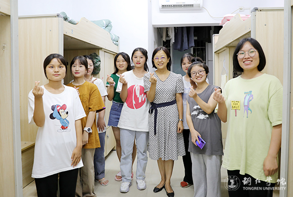 在学生寝室里,侯长林校长、罗静副校长和同学们有说有笑,欢快交流。同学们也开心地邀请侯长林校长、罗静副校长以及老师们一起合影留念。