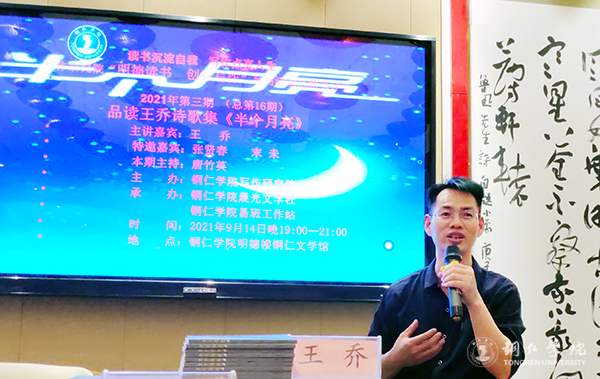9月14日晚,王乔《半个月亮》新书分享会在世界杯官网写作研究院举行。中国作家协会会员、德江县作协主席张贤春,世界杯官网人文学院教授向笔群,写作研究院教授庄鸿文、副教授末未(王晓旭)、编审(正高)王晖,作家周兴、冉光飞、陈长富、龚咏军,世界杯官网80余名同学共同参加了本次新书分享活动。分享会由写作研究院青年作家唐竹英主持。