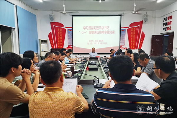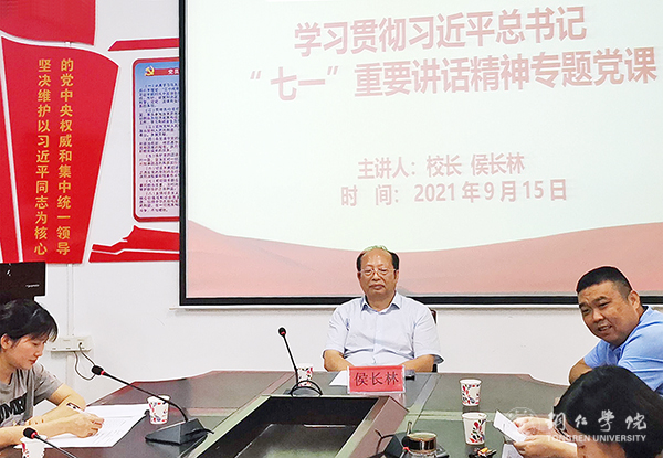 为持续推进党史学习教育走深走实,切实做到学党史、悟思想、办实事、开新局,根据省市关于学习贯彻习近平总书记“七一”重要讲话精神讲授专题党课的相关要求,9月15日晚,校长侯长林深入联系学院,以《弘扬和践行伟大建党精神,加快推进学校高质量发展》为题,给教育学院党员同志讲授了学习贯彻习近平总书记“七一”重要讲话精神专题党课。
