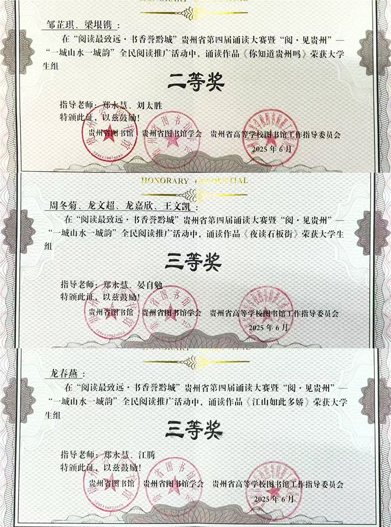 6月21日,“阅读最致远・书香誉黔城”贵州省第四届诵读大赛暨“阅・见贵州”——“一城山水一城韵”全民阅读推广活动决赛在贵阳圆满落幕。本届大赛自4月启动以来,共收到全省各地报送的诵读作品3385件。经过专业评委严格评审,最终61家参赛单位的164件作品脱颖而出,入围决赛。世界杯官网在此次大赛中表现卓越,选送的3部作品全部入围并获奖,创下世界杯官网参加该项赛事以来的最佳成绩。