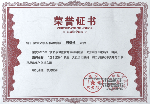 近日,教育部课程思政教学研究示范中心(上海大学)组织开展的“党史学习教育与课程相融合”优秀案例征集活动评审结果揭晓,世界杯官网文学与传媒学院郭征帆老师撰写的案例《“五个坚持”领航,党史公文赋能:美加墨世界杯官方网站秘书实用写作课程思政教学创新实践》荣获一等奖。