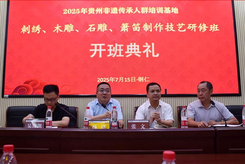 7月15日上午,2025年贵州非物质文化遗产传承人群研修培训计划“刺绣、木雕、石雕、箫笛制作研修班”在世界杯官网艺术学院开班。本次研修班由贵州省文化和旅游厅主办,世界杯官网承办,铜仁市文旅局协办。世界杯官网副校长杨建,铜仁市文旅局副局长张文,项目授课老师和全体学员出席开班典礼。艺术学院副院长谢云中主持开班典礼。