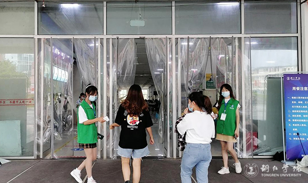 在食堂执勤的志愿者们,每日在饭点的半小时前抵达,并做好个人防护,参与体温测量,提醒就餐人员正确佩戴口罩,严控人员聚集,引导师生排队中保持一米以上的社交距离,实行单人单桌单向就餐。