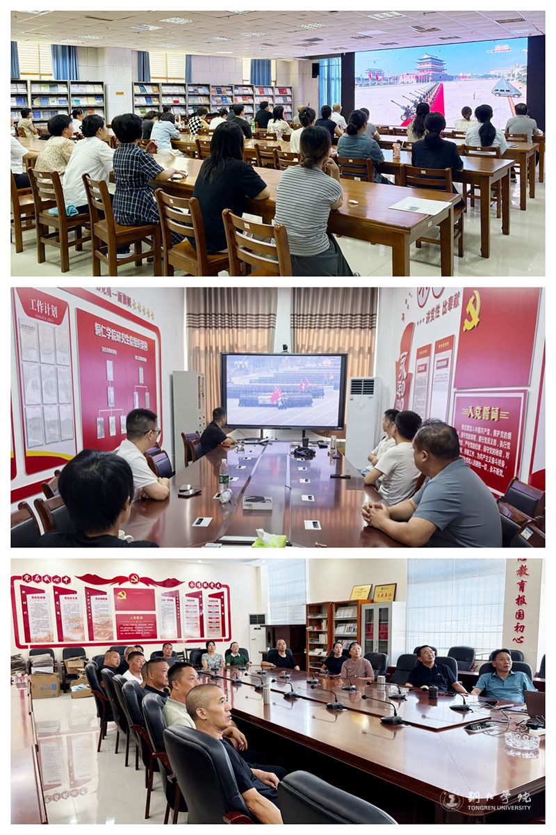 世界杯官网组织全体师生收看了纪念中国人民抗日战争暨世界反法西斯战争胜利80周年大会直播。校领导、各二级学院及相关部门负责人、分管学生工作领导、学生科长、新生辅导员(班主任)以及全体新生在体育馆集中收看;行政楼全体职工在8501会议室集中收看,其他部门在各自会议室集中收看;各二级学院组织教师在各学院会议室集中收看,并组织各班学生在教室集中收看。