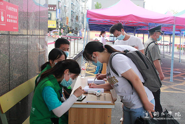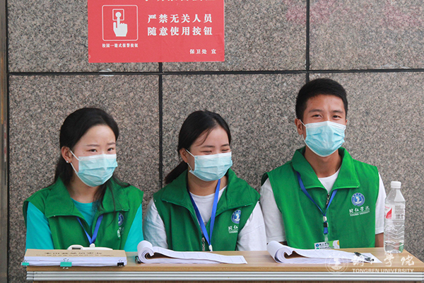 在宿舍门口,宿管阿姨对返校学生再次进行个人相关信息登记,确保学生的安全健康。在食堂,同学们有秩序地按照就餐要求享用食堂叔叔阿姨准备的“回家饭”。在校园里,来来往往的身影和同学间的聊天以及统一身穿“绿马甲”的志愿者们,让美丽的铜院又充满了青春气息与欢声笑。