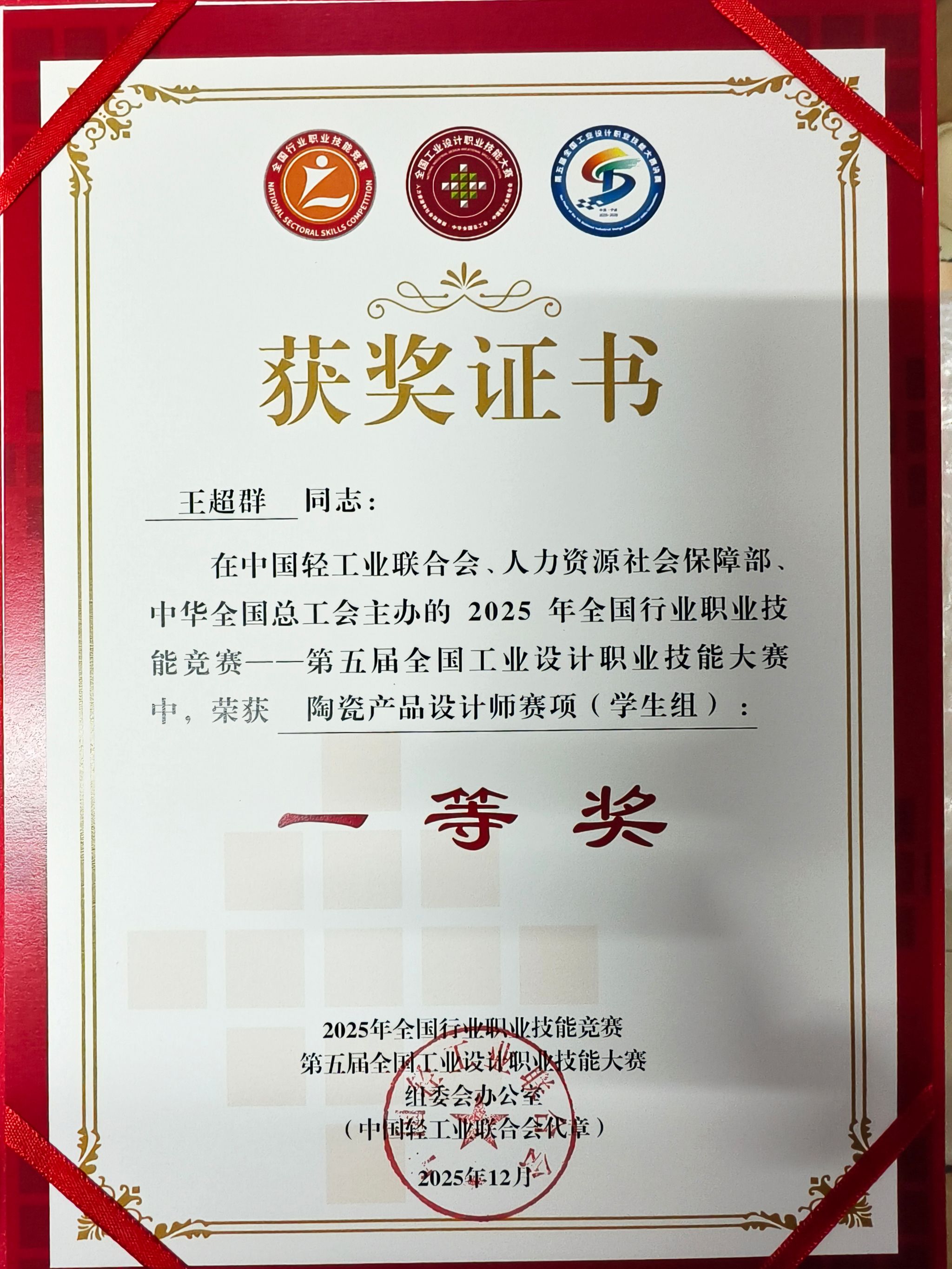 自赛事启动以来,王超群同学在指导老师的悉心指导下,全身心投入备赛。备赛期间,他深入研究赛事评价标准,聚焦陶瓷产业升级需求,将传统文化元素与现代生活美学相融合,反复打磨设计方案,在传统工艺技法与数字技术应用的融合上不断突破。比赛现场,面对高强度的竞技压力和复杂的创作要求,王超群沉着冷静、有条不紊地完成了作品的创意构思、图纸绘制及实物制作全流程,其作品因设计品质优异、适配工业生产流程,得到了评委的一致认可和好评。