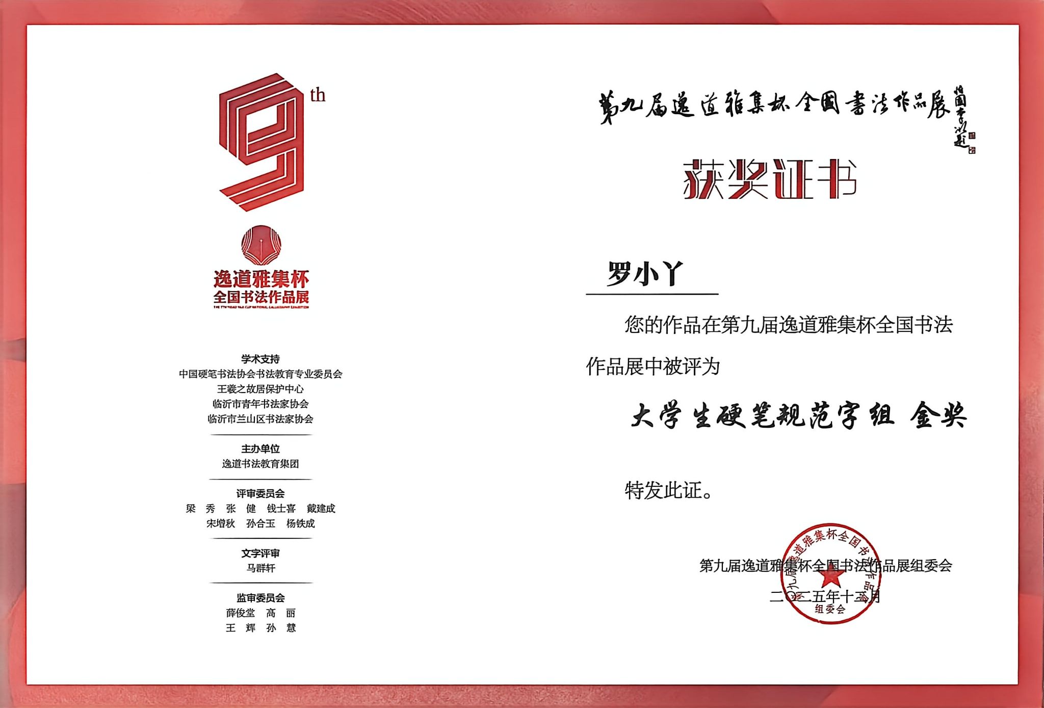 在大学生硬笔规范字组的激烈角逐中,世界杯官网秘书学专业2025级罗小丫同学凭借精湛的书写技艺与规范的用字表达摘得金奖,2024级陈湘同学荣获银奖,2024级薛丽娅、2025级杨佳宇同学斩获铜奖,2022级方敏、阮恩兰2024级谢清赵淇芮四位同学也凭借扎实的书写功底与标准的语言文字运用获得佳作奖。同学们的作品不仅笔法工整、结构匀称,更严格遵循国家通用语言文字规范,将汉字的形美与义美完美融合,展现了青年一代对规范使用国家通用语言文字的自觉践行。