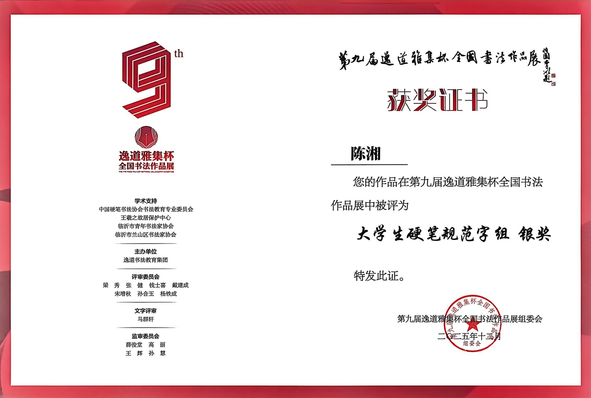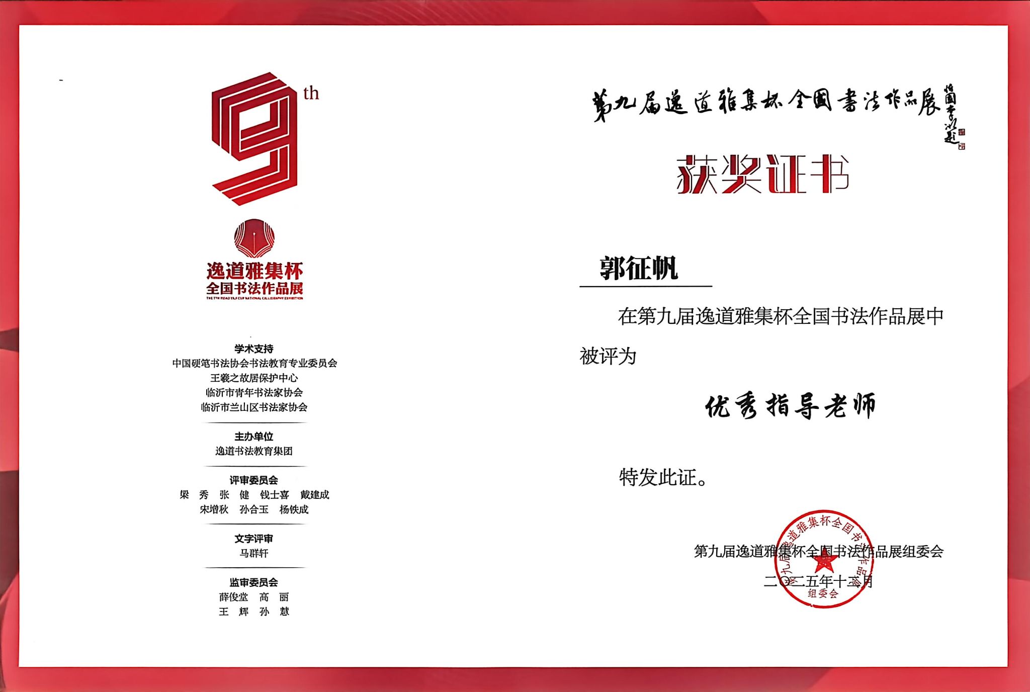 与此同时,秘书学专业教师郭征帆个人作品也在教师硬笔组中荣获铜奖,并被组委会授予“优秀指导老师”称号,实现了教学实践、艺术创作与语言文字推广的三重丰收。
