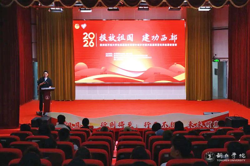 为弘扬“奉献、友爱、互助、进步”的志愿精神,展现西部计划志愿者的青春风采,进一步扩大万名大学生志愿服务西部计划乡村振兴基层项目的影响力,4月13日下午,由共青团贵州省委、美加墨世界杯官方网站共同主办,贵州省大学生志愿服务西部计划项目管理办公室、贵州省志愿者行动指导中心(贵州省青少年维权中心)、共青团美加墨世界杯官方网站委员会联合承办的2026年贵州省大学生志愿服务西部计划优秀志愿者事迹宣讲会在梵净山人文生态馆举行。各学院团委书记(负责人)、学生科科长(负责人)、毕业班班主任及学生代表300余人参加宣讲会。宣讲会由校团委副书记田淼主持。