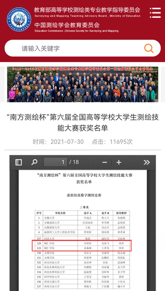 七月,骄阳似火,奥运健儿争金夺银,铜院学子奋勇拼搏。近日,2021年“南方测绘杯”第六届全国高等学校大学生测绘技能大赛在贵州大学举行。此次大赛由全国高校测绘类专业竞赛联盟和自然资源部职业技能鉴定指导中心主办,贵州大学承办,南方测绘集团协办。世界杯官网土木工程专业三组选手参加了虚拟仿真数字测图竞赛,两组选手荣获全国二等奖。