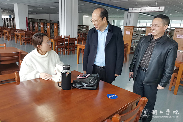 侯长林、代亮先后考察了图书馆学生自主活动中心、音像室、点对点服务室、24小时自修区等区域,仔细询问了这些区域的用途、运行管理情况。在24小时自修区,侯长林、代亮分别和正在学习的同学们进行了交流,听取了同学们对图书馆的建议和意见,对准备考研的学生进行了辅导,希望同学们利用好图书文献资源,专心学习,并祝愿他们能如愿考上研究生。