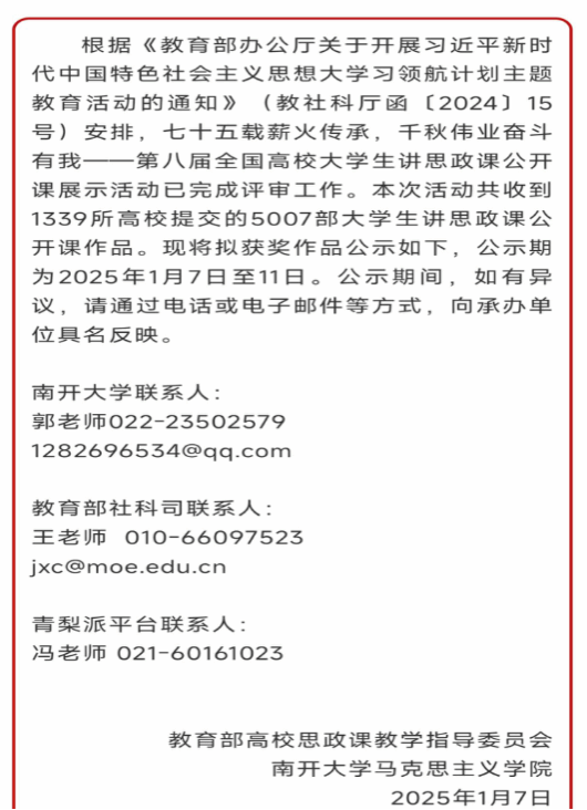 全国高校大学生讲思政课公开课展示活动由教育部高等学校思想政治理论课教学指导委员会主办,是习近平新时代中国特色社会主义思想大学习领航计划主题教育活动之一。本届赛事分为本科组、高职组和专项组三个组别进行评选汇聚全国1339所高校的5007部佳作,角逐激烈。其中,本科组共评选了特等奖16项、一等奖48项、二等奖项95、三等奖159项,共318项。