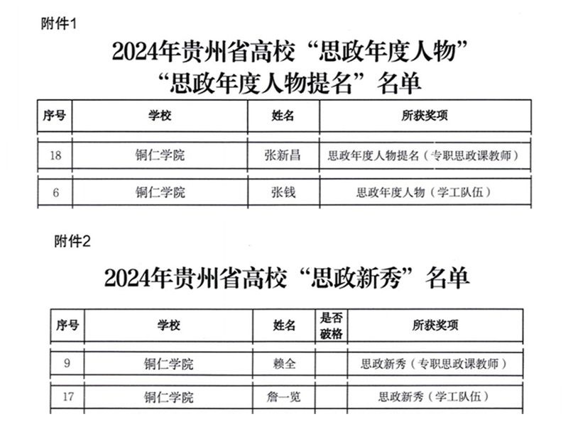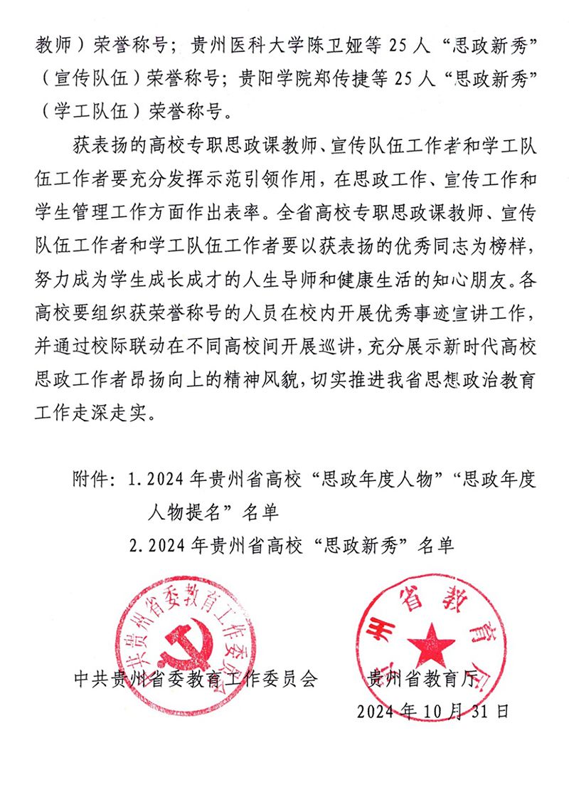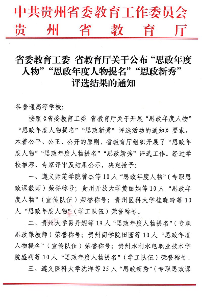 近日,省委教育工委、省教育厅印发通知,公布了2024年贵州省高校“思政年度人物”“思政年度人物提名”“思政新秀”名单。经过学校推荐、专家评审,世界杯官网张新昌同志获评为“思政年度人物提名”(专职思政课教师)、张钱同志获评为“思政年度人物”(学工队伍)、赖全同志获评为“思政新秀”(专职思政课教师)、詹一览同志获评为“思政新秀”(学工队伍)。