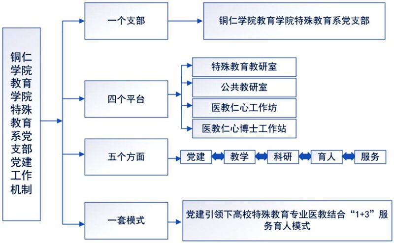特殊教育系党支部充分发挥基层党组织的政治功能、组织功能和服务功能,按照“党建引领、融合发展、特色发展”的工作理念,运用“三研”工作方法(用研究的思维开展工作、用研究的成果体现工作、用研究的水平推动工作),紧紧围绕党建中心工作,将支部建设与学科专业发展深度融合,发挥基层党组织的战斗堡垒作用和党员的先锋模范作用。以党建示范创建、质量创优为指引,创建打造了“党建引领·教康融合·协同育人”党建品牌,并结合职能职责创新开展党建工作,形成了“党建引领下特殊教育专业医教结合‘1+3’服务育人”模式,构建了“1451”党建工作机制。不断推动党建工作与教学、科研、社会服务等育人工作深度融合,为加快学科专业与人才培养提供了坚强的政治保障和组织保障。