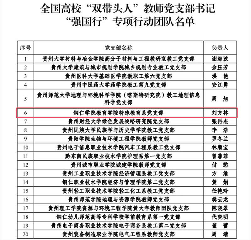 近日,全国高校“双带头人”教师党支部书记“强国行”专项行动团队名单公布,1486名高校“双带头人”教师党支部书记(以下简称“双带头人”)入选,覆盖全国31个省(区、市)和新疆生产建设兵团的953所高校。其中,贵州省有20高校“双带头人”教师党支部书记入选世界杯官网教育学院特殊教育系党支部书记刘方林入选。